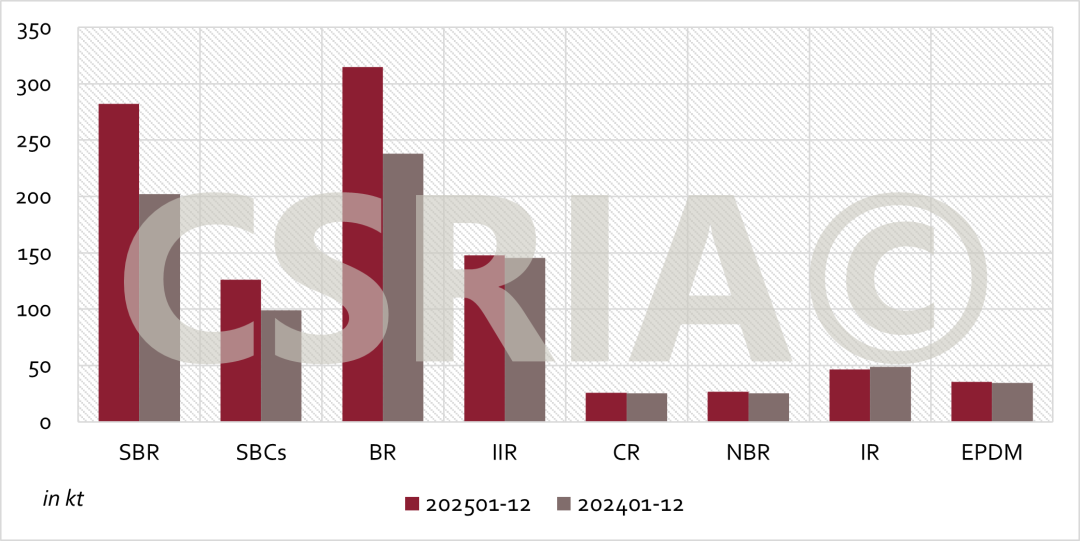 据中国合成橡胶工业协会监测,2025年1~12月,我国共进口主要合成橡胶158.7万吨,与2024年同期相比增加18.5万吨,增幅13%,各主要胶种进口概况如图1所示。