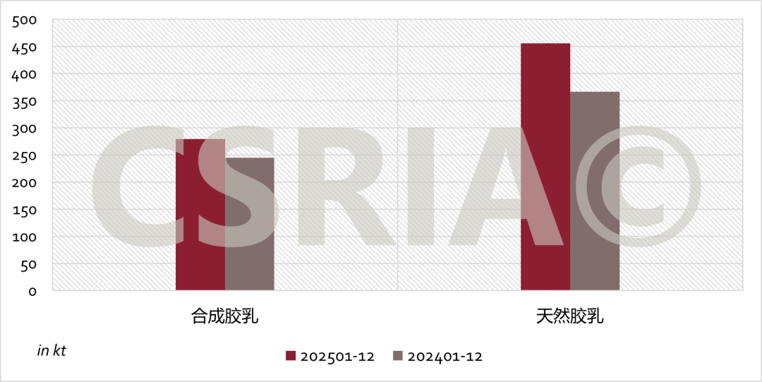 2025年1~12月,我国共进口合成胶乳27.9万吨,与2024年同期相比增加14%;进口天然胶乳共45.5万吨,同比增加24%,合成胶乳、天然胶乳进口概况如图3所示。
